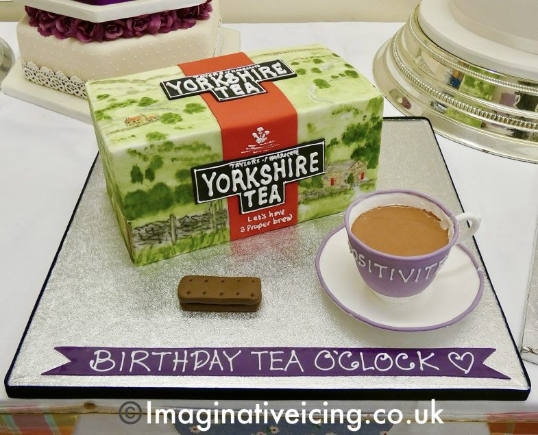 Birthday Tea O’Clock ! This birthday cake was made for a true fan of Yorkshire Tea. The box of tea is the cake and comes complete with a sugarcrafted cup of tea on its saucer and bourbon biscuit. The inscription is piped in royal icing on an icing strip.